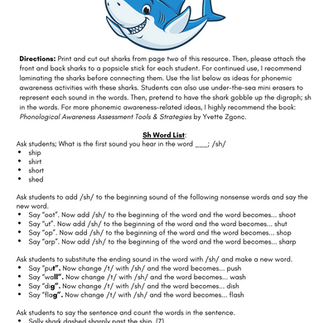 Here is a resource I have made for a phonemic awareness (P.A.) activity for my students learning /sh/. I had students use the printout sharks to gobble up fish erasers and gems when completing this activity. We then continued utilizing this tool to continue other P.A. activities throughout the week.